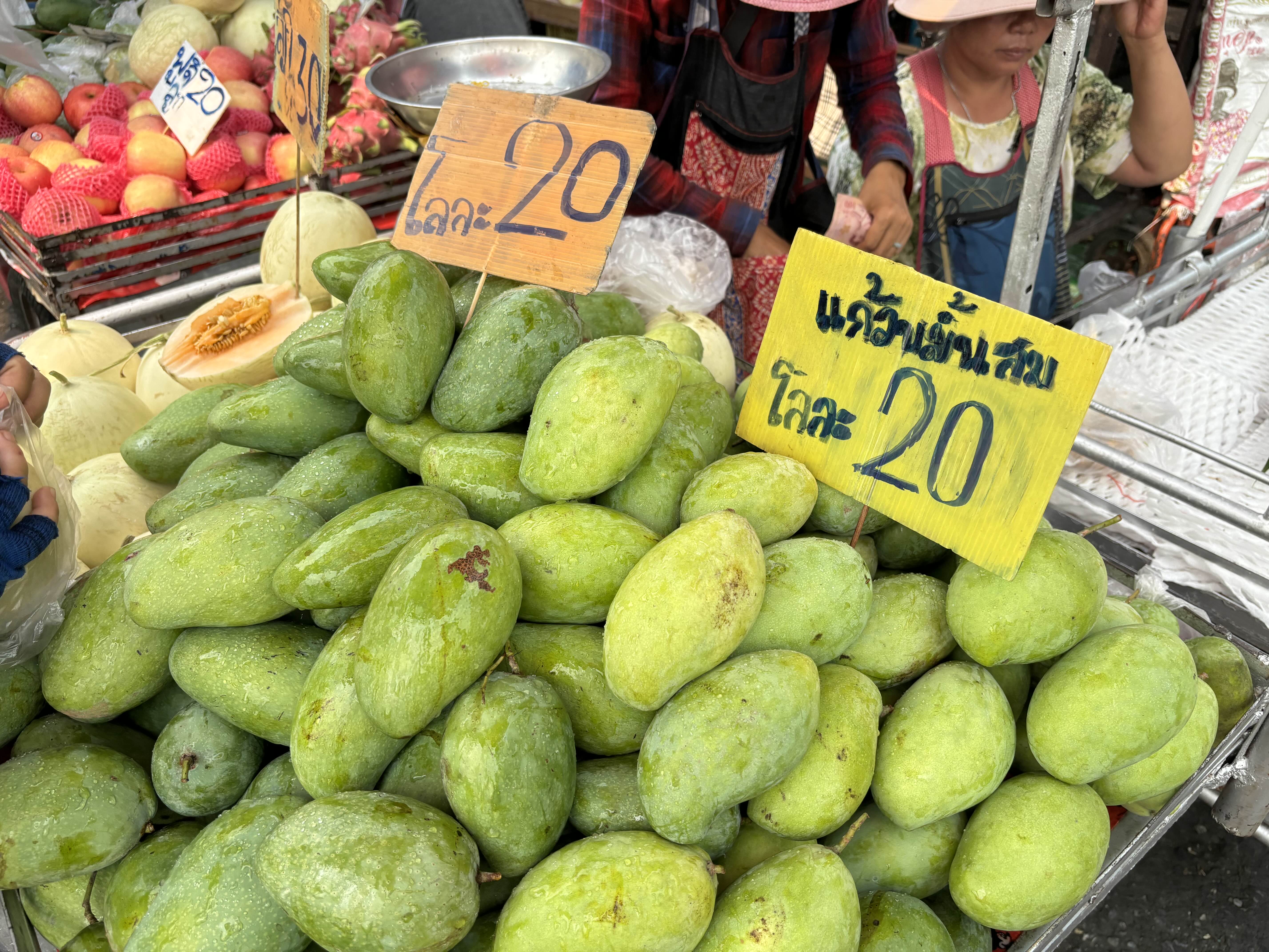 빈손으로 돌아가기엔 바이크 타고 여기까지 나온 수고가 너무나 아까워 초록 망고를 사보기로 한다 시지만 않았으면 좋겠다라고 구입하긴 했는데 저 두 종류의 망고가 어떤 차이가 있는지는 몰라 운에 맡기기로 하고 오른쪽 초록 망고와 멜론 1개해서 50밧치 구입을 한다