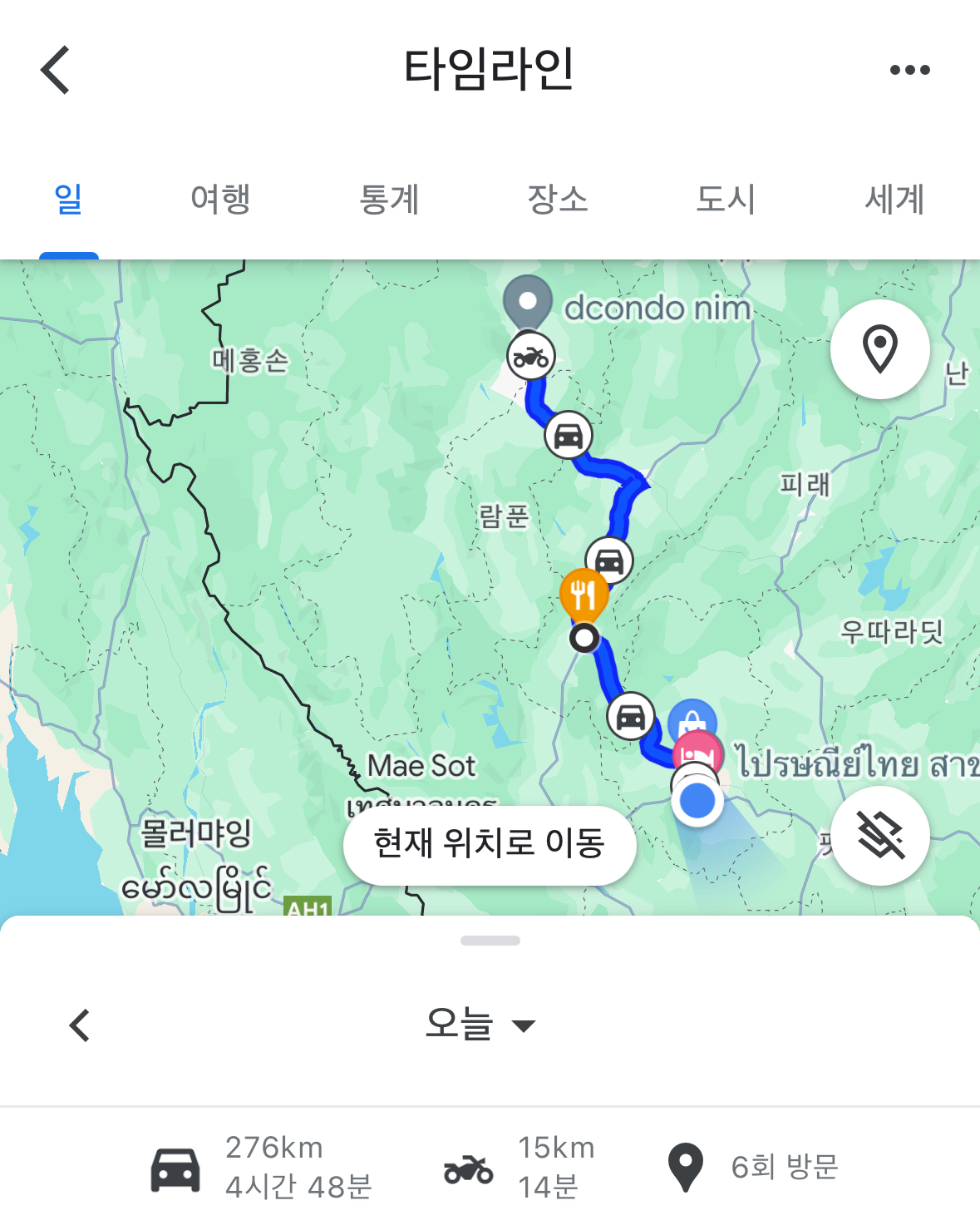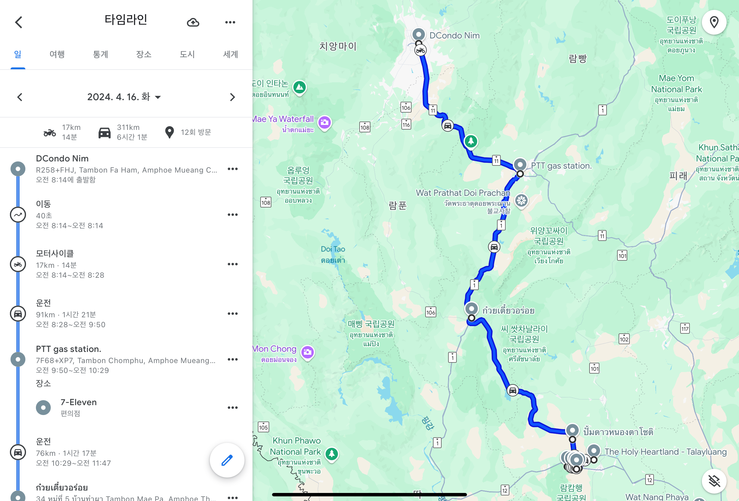 아래 이미지는 첫날 치앙마이에서 수코타이로 바이크로 이동한 실제 경로 구글맵 기록이다