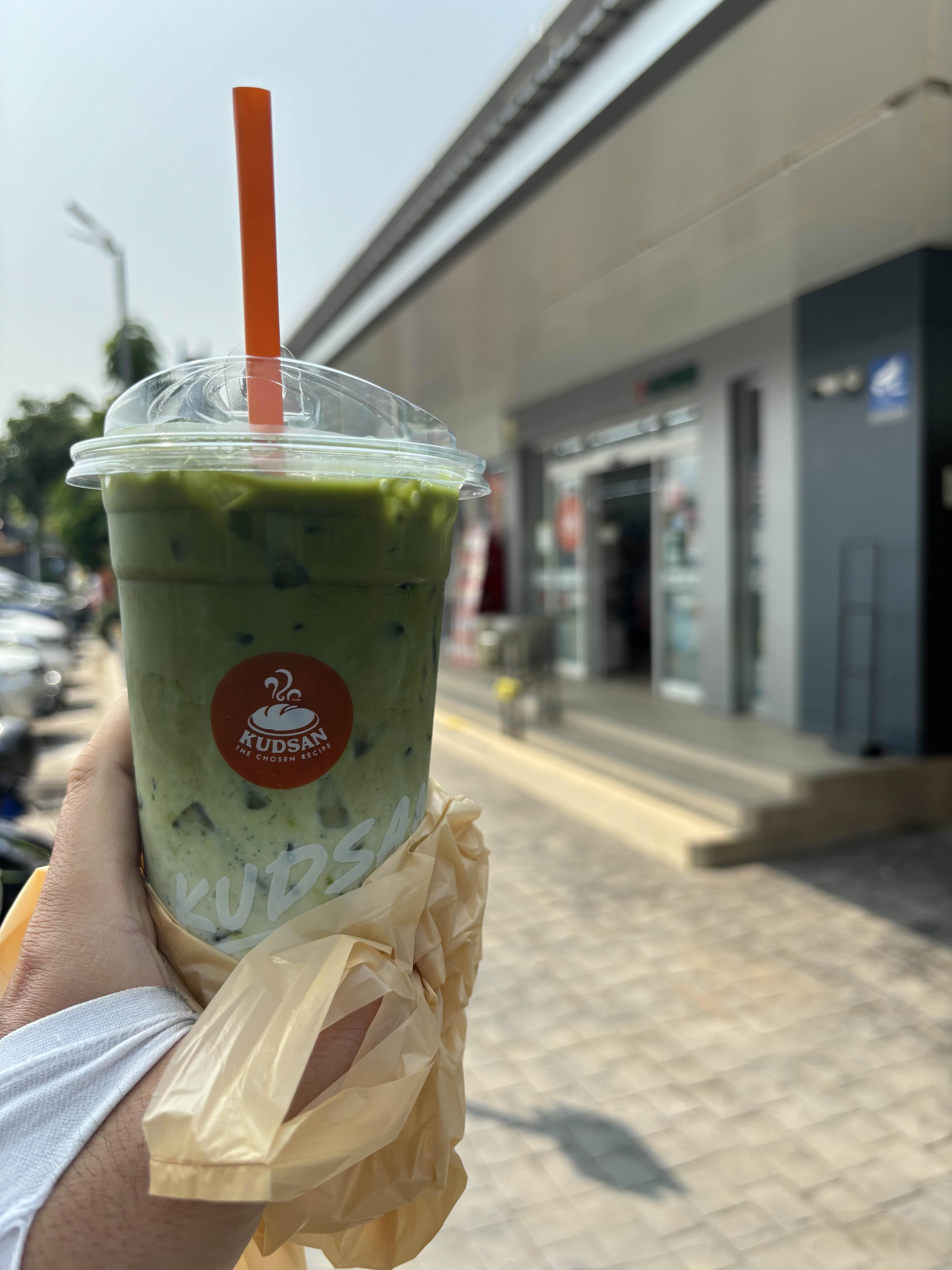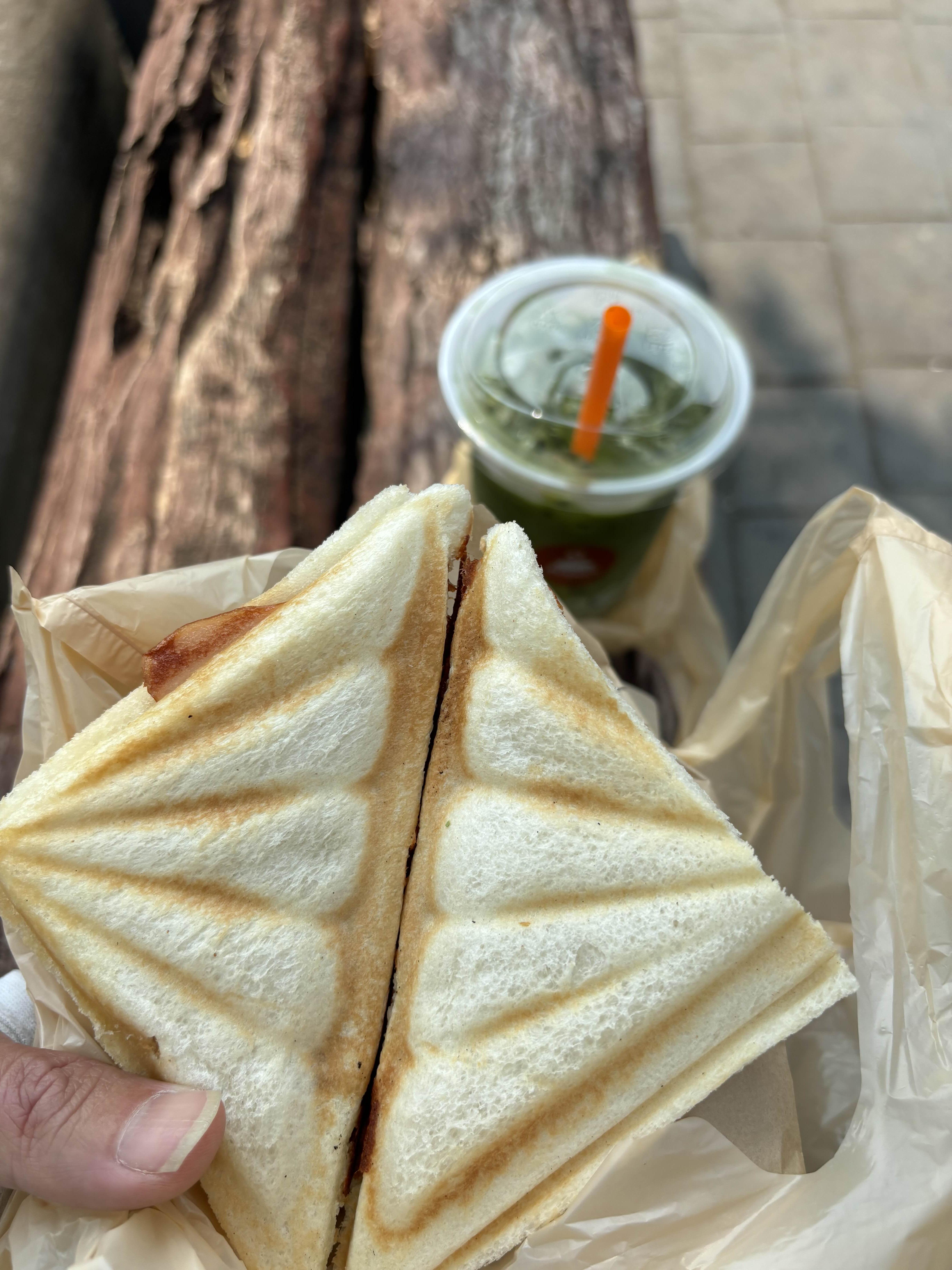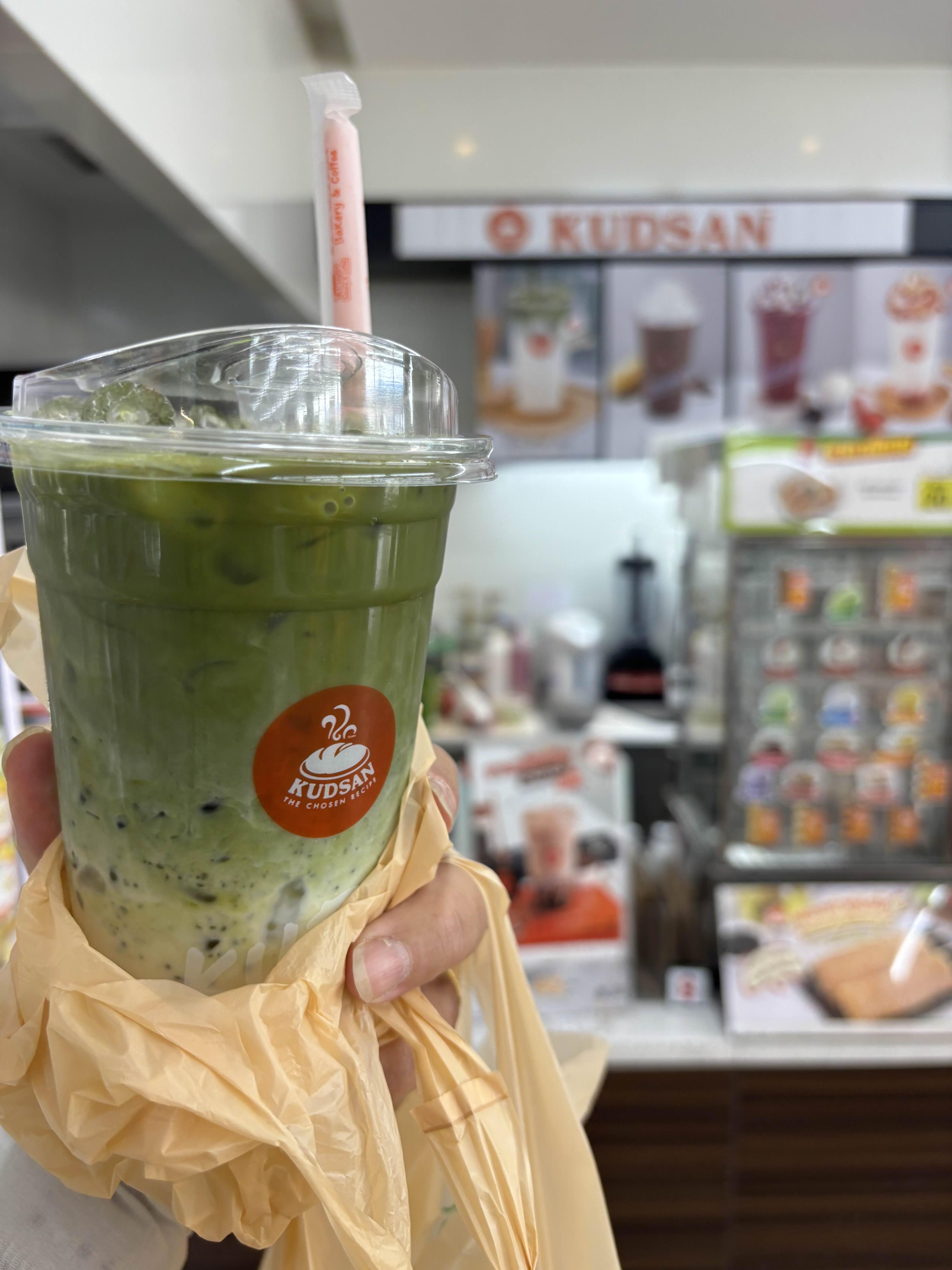 마차라떼를 주문하고 편의점 샌드위치를 구매한다