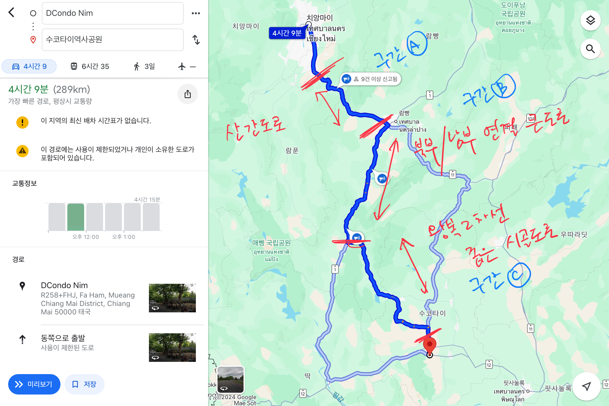 이곳까지 오는 길은 주로 치앙마이를 벗어나면 바로 산간길로 이어지는데 남북을 연결하는 도로여서 그런지 도로는 좁지 않았지만 대신 대형 트럭들이 많이 다니고 있었고 도로 가장자리를 따라 달렸지만 간간히 도로에 패인 큰 웅덩이가 갑자기 나타나거나 혹은 큰 돌들이 떨어져 있어 깜짝 놀라는 경우가 여러번 있었다(구간 A)