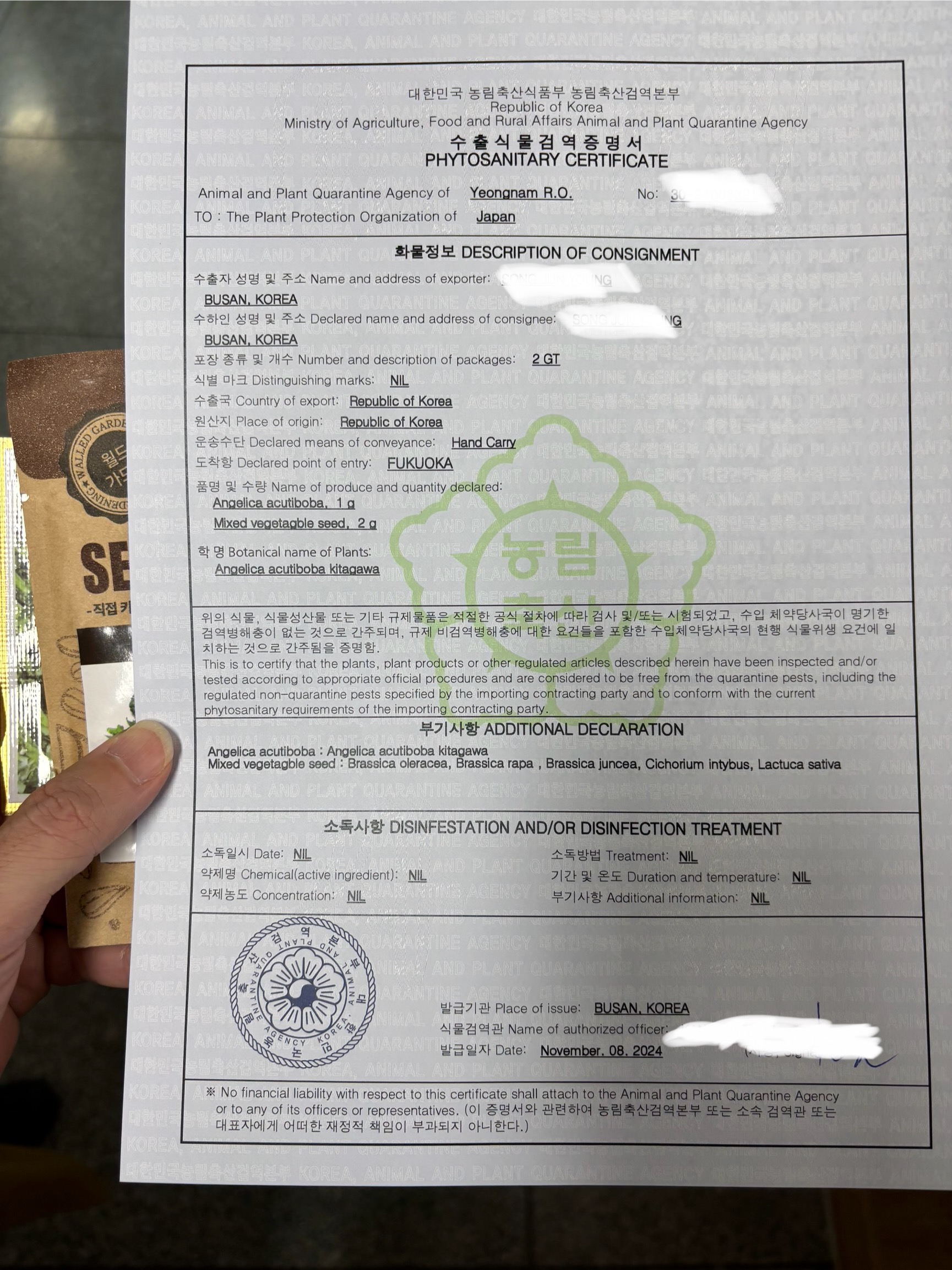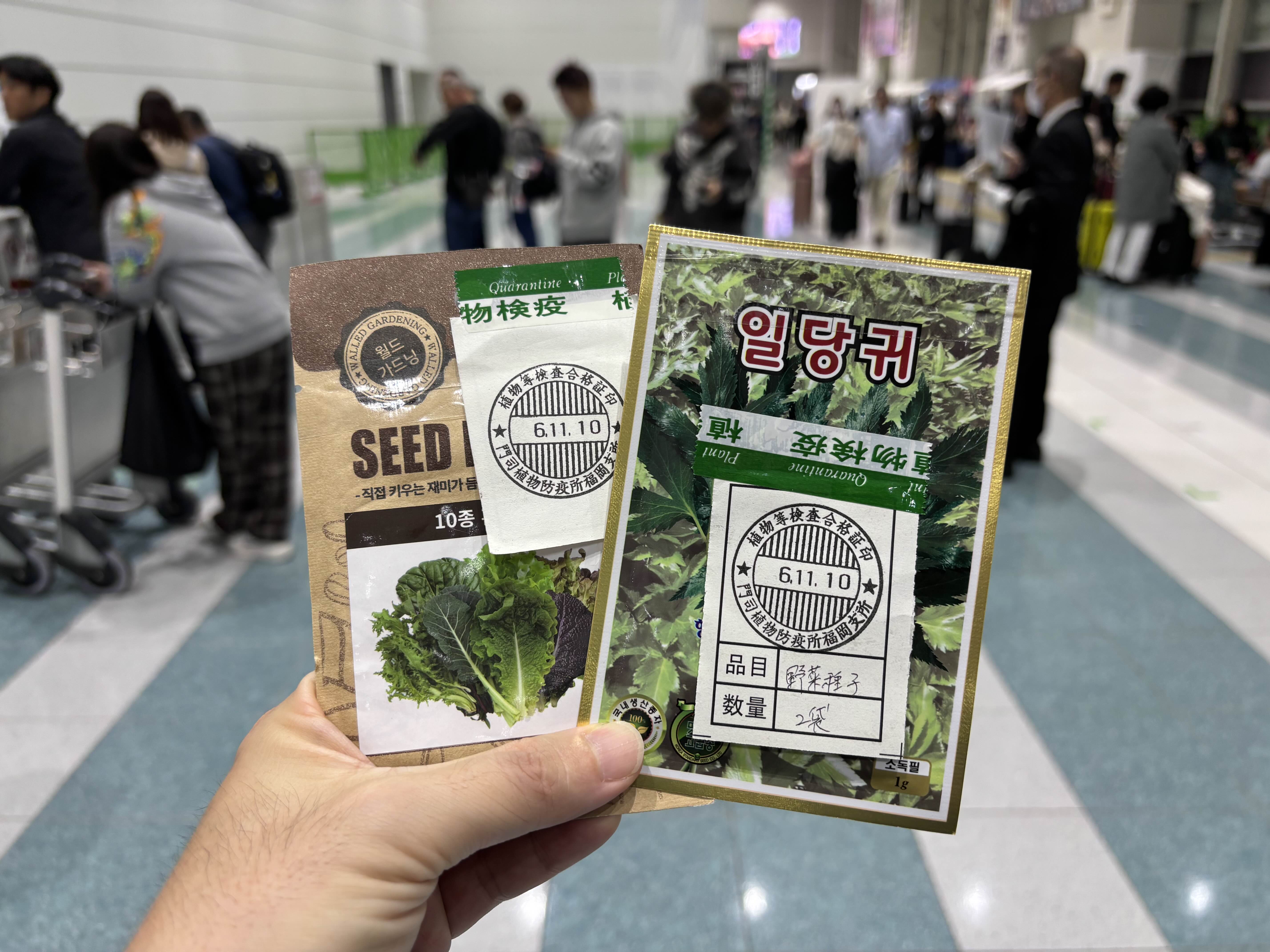 좀 시간은 걸렸지만 결국 이렇게 씨앗봉투에 검역 완료 도장을 받고 무사히 입국 완료했습니다