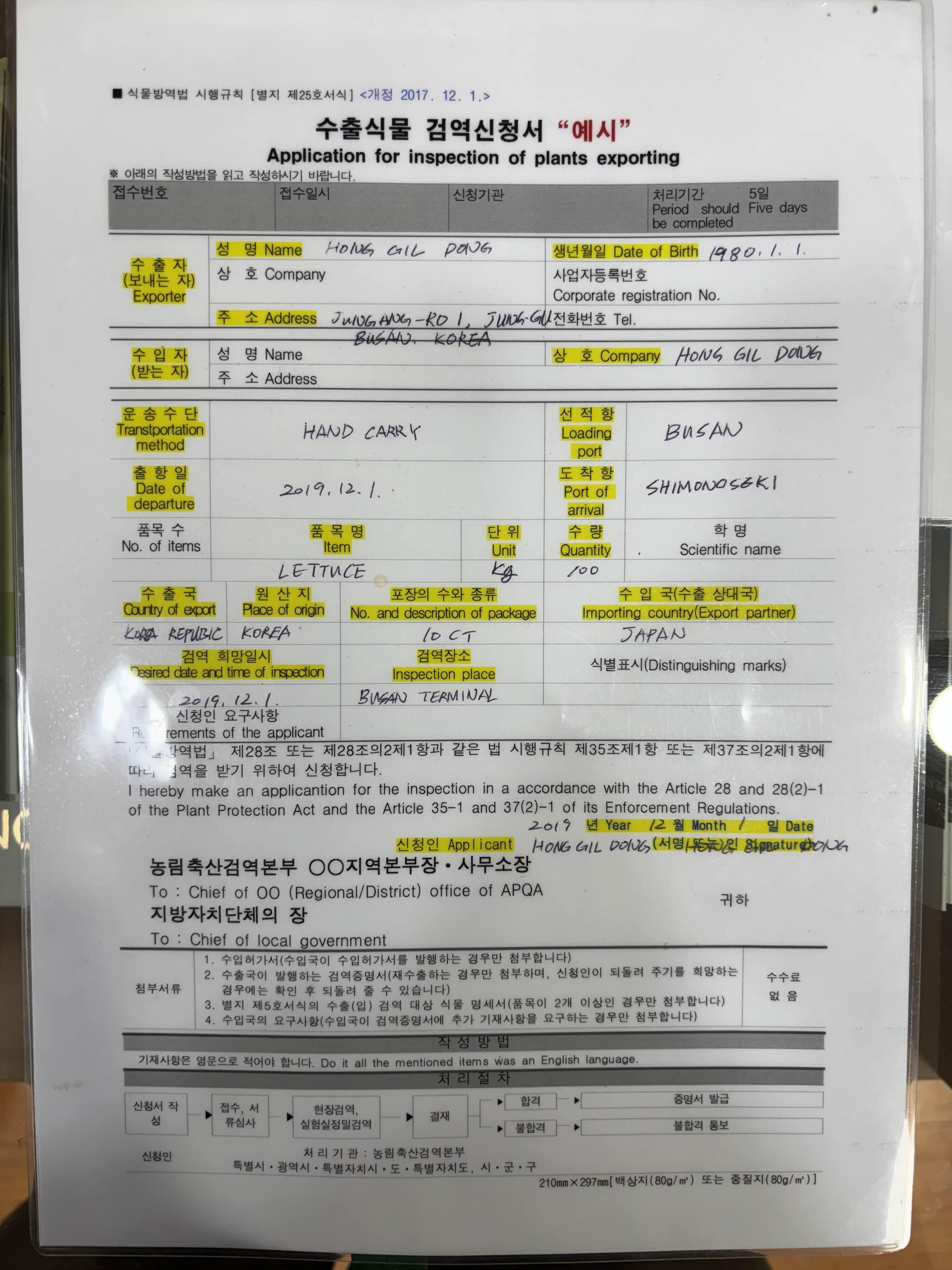 후쿠오카 공항 식물검역소에 한국에서 발급받은 검역증 서류와 씨앗을 제출하니