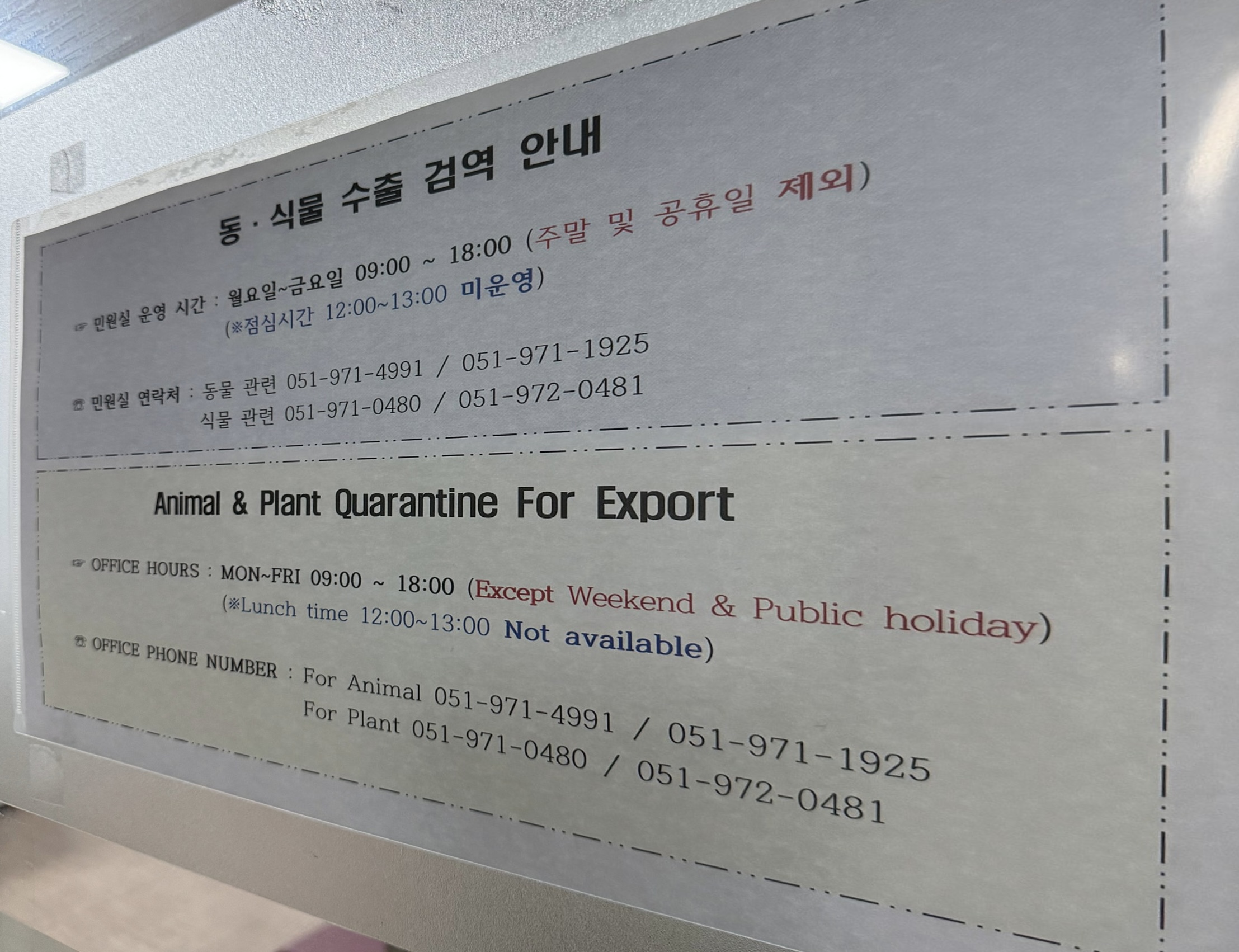출국일이 휴일임에도 검역증명서 발급 가능한 방법을 다행히도 찾았기에 안도해서 그랬는지 몰라도 검역소 직원분은 여타 관공서 분들과 달리 매우 친절했습니다