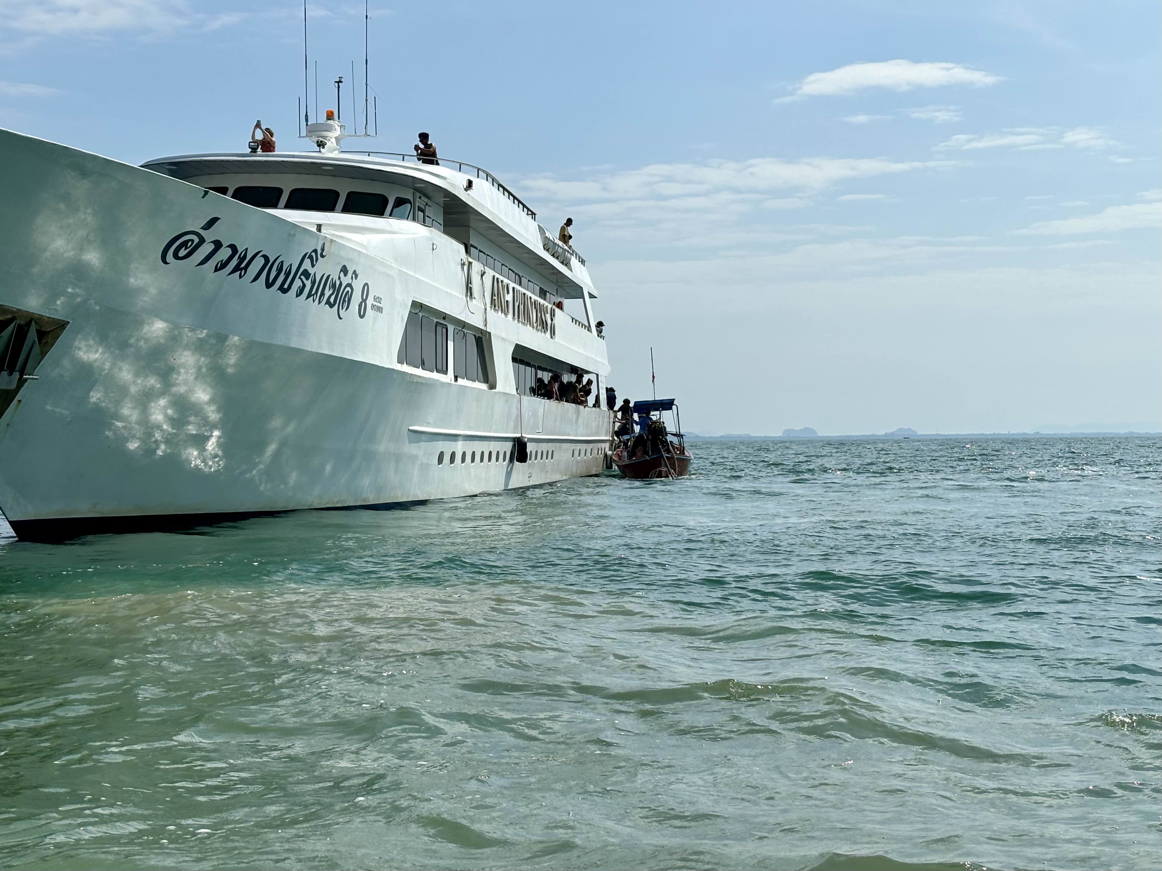 아마 저 배로 바다 한 가운데서 옮겨 타야 하는 거 같다
