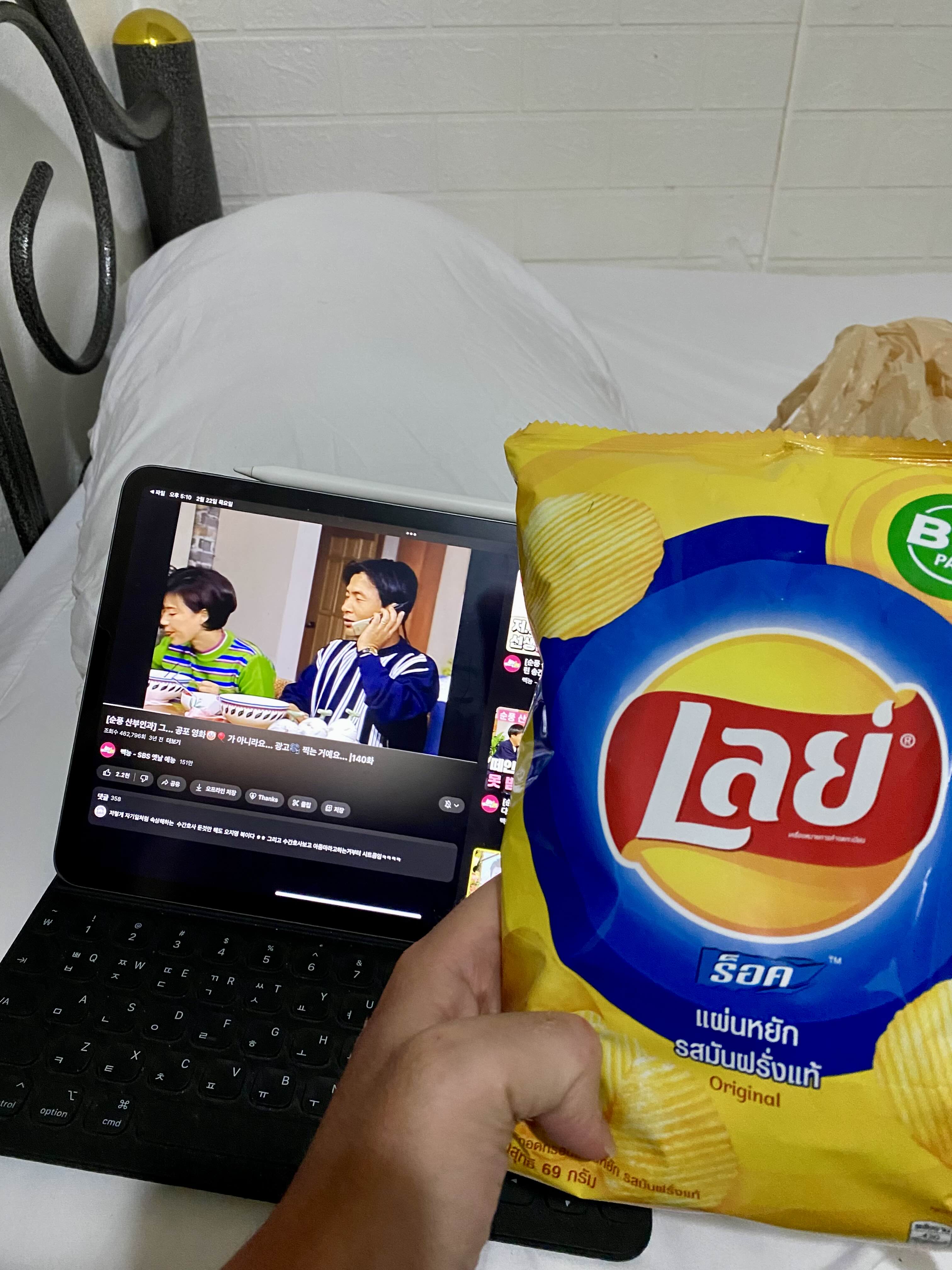 숙소에서 아픈 발도 좀 쉬게할겸 과자를 먹으며 유튜브를 봤다 ㅎ